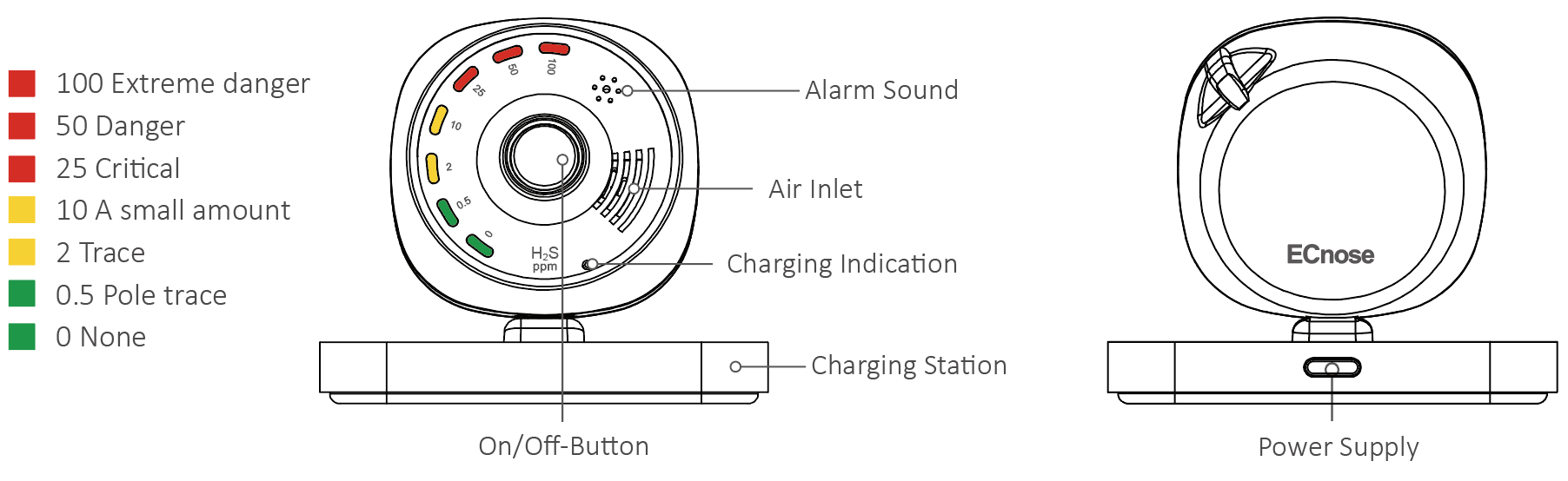 · Yellow and red LED alerts will signal when hydrogen sulfide levels are at dangerous levels.