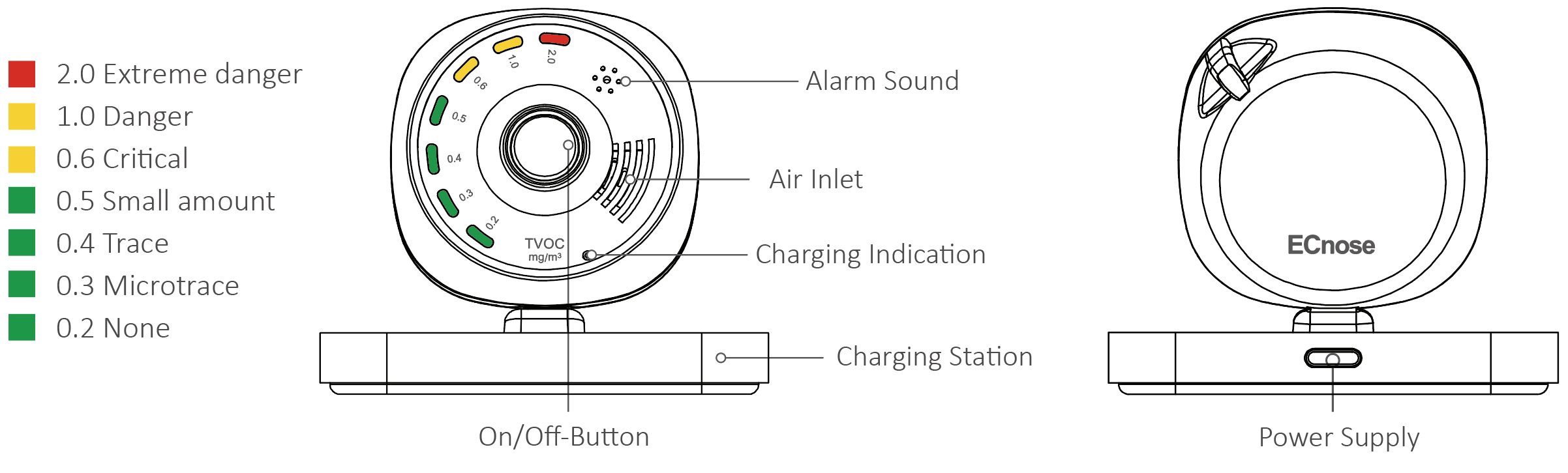 · Yellow and red LED alerts will signal when TVOC levels are at dangerous levels.