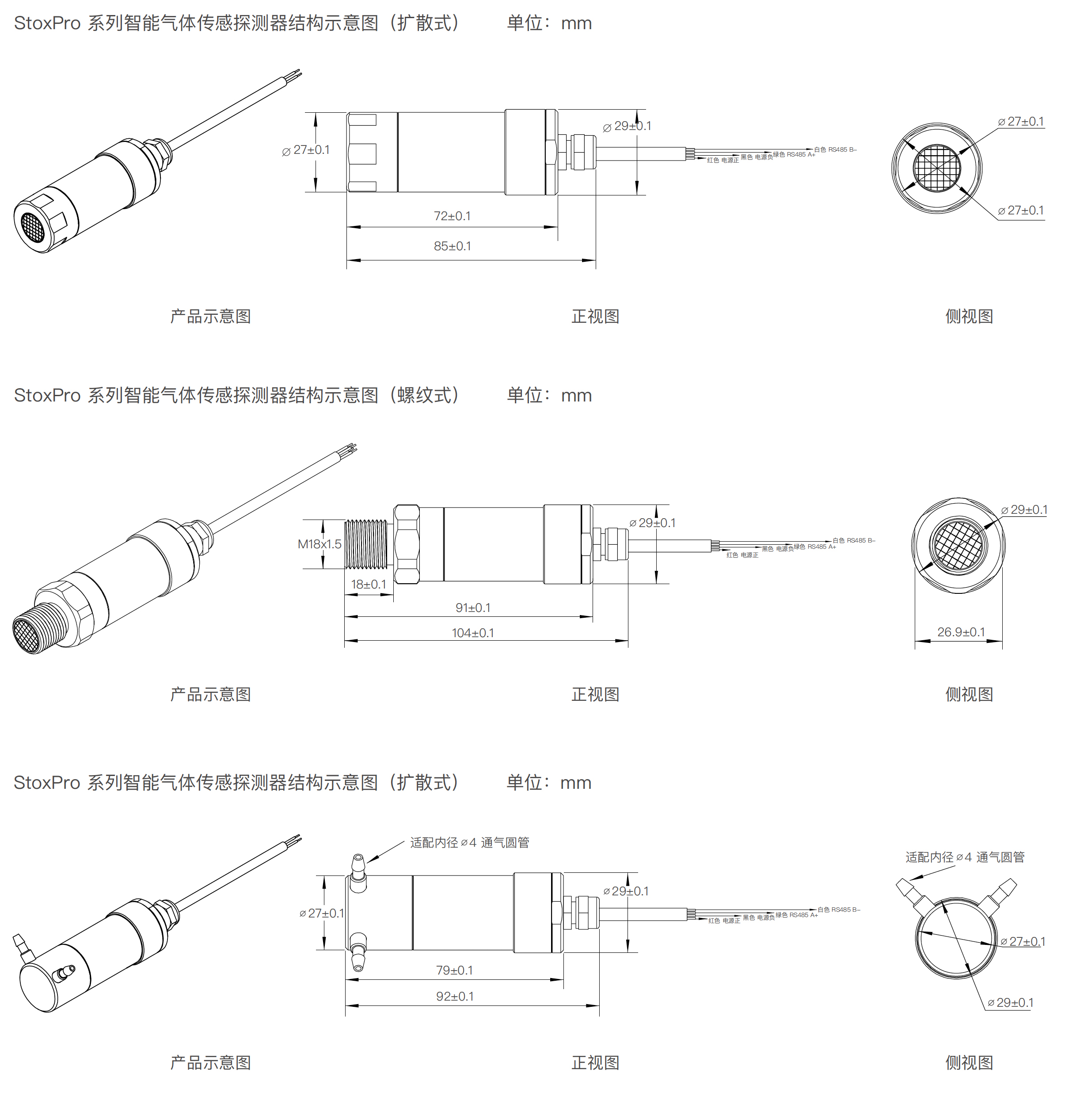 StoxPro 的外壳前盖设计了三种不同的结构形态,扩散式,流量式,螺纹式,扩散式适用于被检测气体存在于开放式的空间中,气体通过自然扩散对流的方式与传感器接触。流量式适用于被检测气体通过气体采样泵主动抽取至传感器或被检测气体环境中的压力为正压(或者带流速)气体通过流动到达传感器。螺纹式适用于检测密闭空间中的气体浓度并采用螺纹或法兰密封的安装方式。